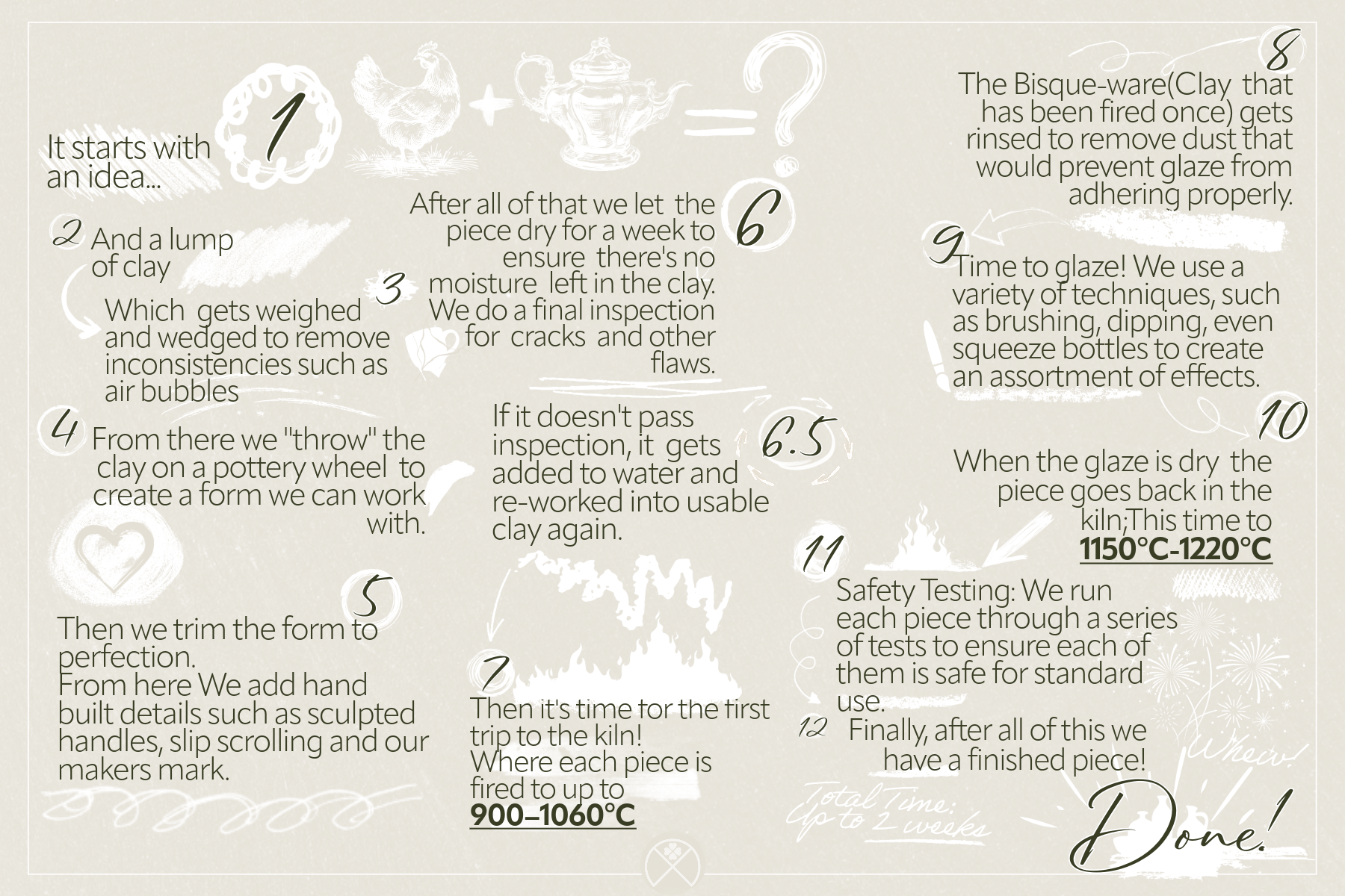 One of the most common questions we get asked is how we make ceramics, so to answer this we’ve created this graphic illustrating the break down of the 12 basic steps of how we create ceramics on the pottery wheel.